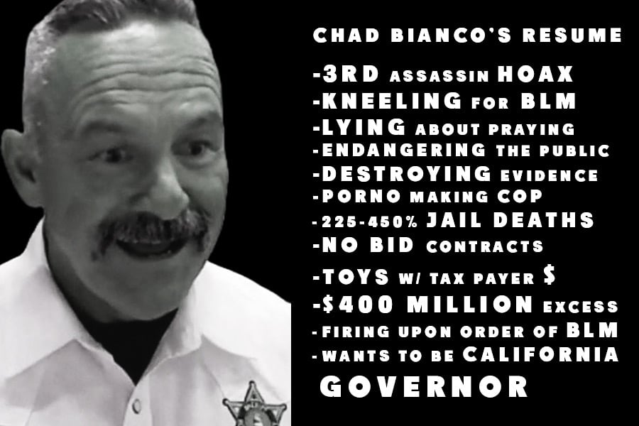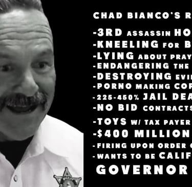 Sheriff Chad Bianco knowingly falsely accused Vem Miller of being "the 3rd Trump assassin", in order to appear as a fake hero, for his planned Governor of California. Deeper dives into the history and past of Chad Bianco revealed a litany of corruptions and criminal behavior, including: Erasure of evidence, Erasure of body cams, "loss" of 60 kilos of fentanyl, 225-450% excess jail deaths, kneeling for BLM and lying about it under oath, covering up felonious crimes for friends, reporting false information to the FBI, employing an only fans porno cop, and more.